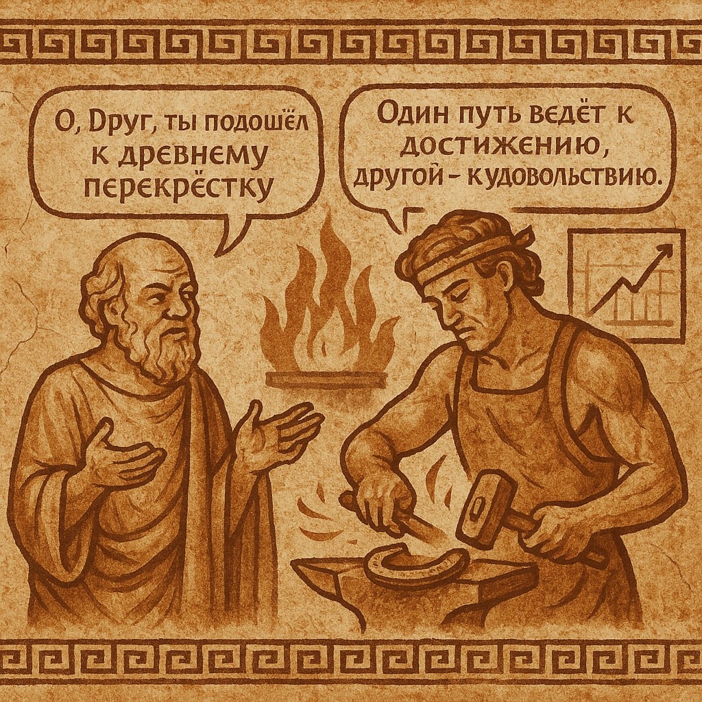 💬 Диалог о целях, процессе и природе предпринимательства — Сократ, я разрываюсь между "добивайся целей" и "наслаждайся процессом". Где золотая середина? — О, Друг, ты задал вопрос, над которым бьются все мудрецы с тех пор, как первый философ продал первую консультацию. — Всё шутишь, старик. — Представь двух кузнецов: Первый бьёт по наковальне, потому что должен сделать 100 подков к завтрашнему утру Второй — потому что слышит музыку в звоне металла — И кто из них прав? — Оба! Но первый — хороший работник, а второй — потенциальный создатель булатной стали. Вот тебе три предпринимательских мудрости: 1. Природу не перехитришь 10% команды бегут за результатом, 70% идут по привычке, 20% уже мысленно на пляже. Как лев не станет травоядным, так и «человек процесса» не превратится в «человека результата». Мудрый лидер знает — нужно ставить задачи соответственно природе сотрудника. 2. Деньги — кислород бизнеса Но дышать — не значит жить. Найди баланс между "надо" и "хочу", иначе либо р