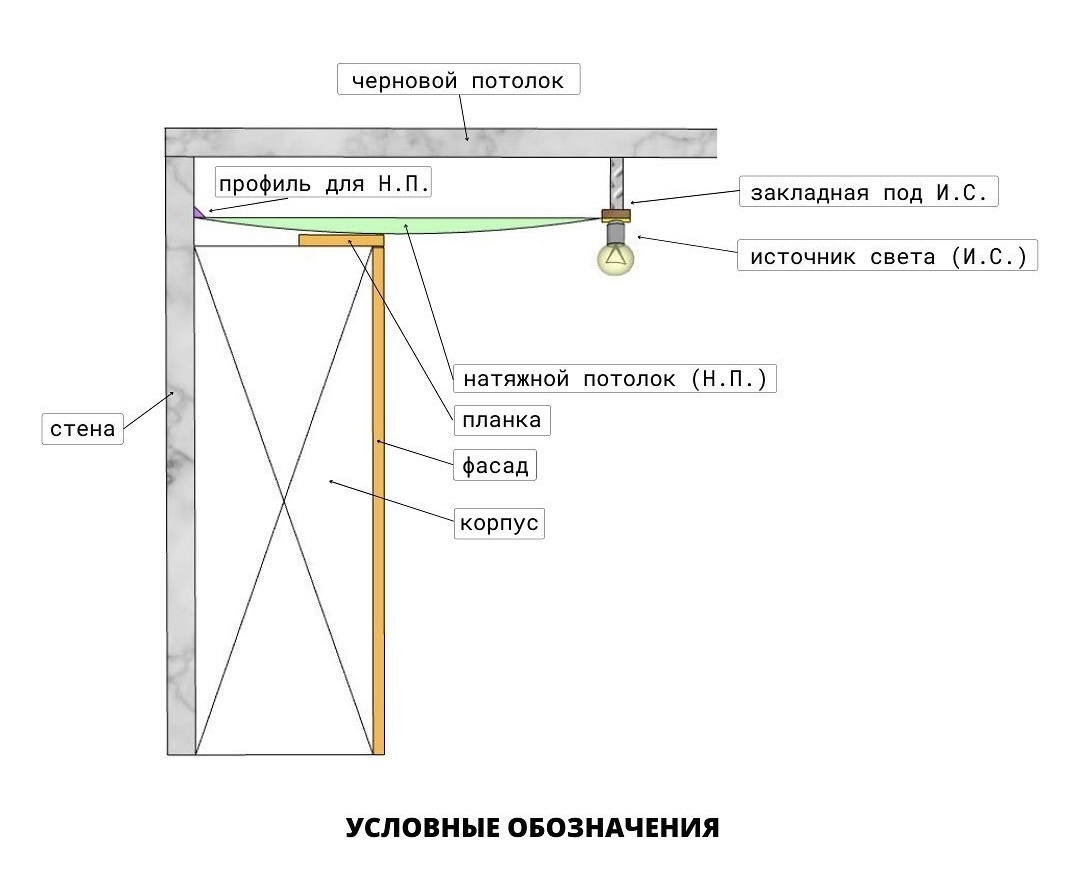 Начнем с основной проблемы (особенности) натяжного потолка - способность провисать под собственным весом. Данное свойство влечет за собой правильное проектирование потолочного конструктива. Самая распространенная системная ошибка тех, кто делает ремонт сам без проекта - " Сейчас мы сделаем ремонт и потом закажем мебель" Если вы уже сделали натяжной потолок и хотите мебель до потолка, то в 90% случаев ничего не получится н.п. - натяжной потолок и.с. - источник света Провисание потолка напрямую зависит от расстояния между профилем для Н.П и закладной под И.С. Следовательно, если повесить кухню или поставить шкаф под потолок, при открывании дверок они будут задевать (повреждать) натяжной потолок. В результате мебель необходимо делать с отступом от потолка (зазор 5-10см) Бывает, устанавливают планку сверху корпуса - смотрится еще хуже. Планка, действительно, отдаляет натяжной потолок от фасада, что уменьшает риск повредить потолок. Но сохраняется проблема с горизонтальным провисанием п