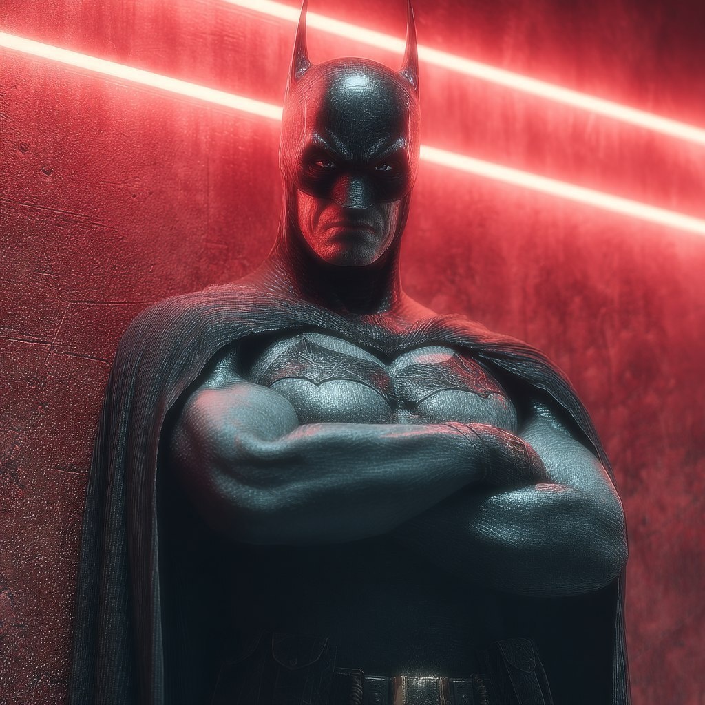 Создано на основе запроса: batman, with an evil smile, standing in centre full body, with black and red neon lightings behind --- Автоперевод: Бэтмен, со злой улыбкой, стоящей в центре всего тела, с черными и красными неоновыми освещениями позади Как тебе эта картинка? 🤔 https://dzen.ru/id/65c0c65c86e4f837c27b24d7 #ИИ #AI #нейросеть #midjourney #art