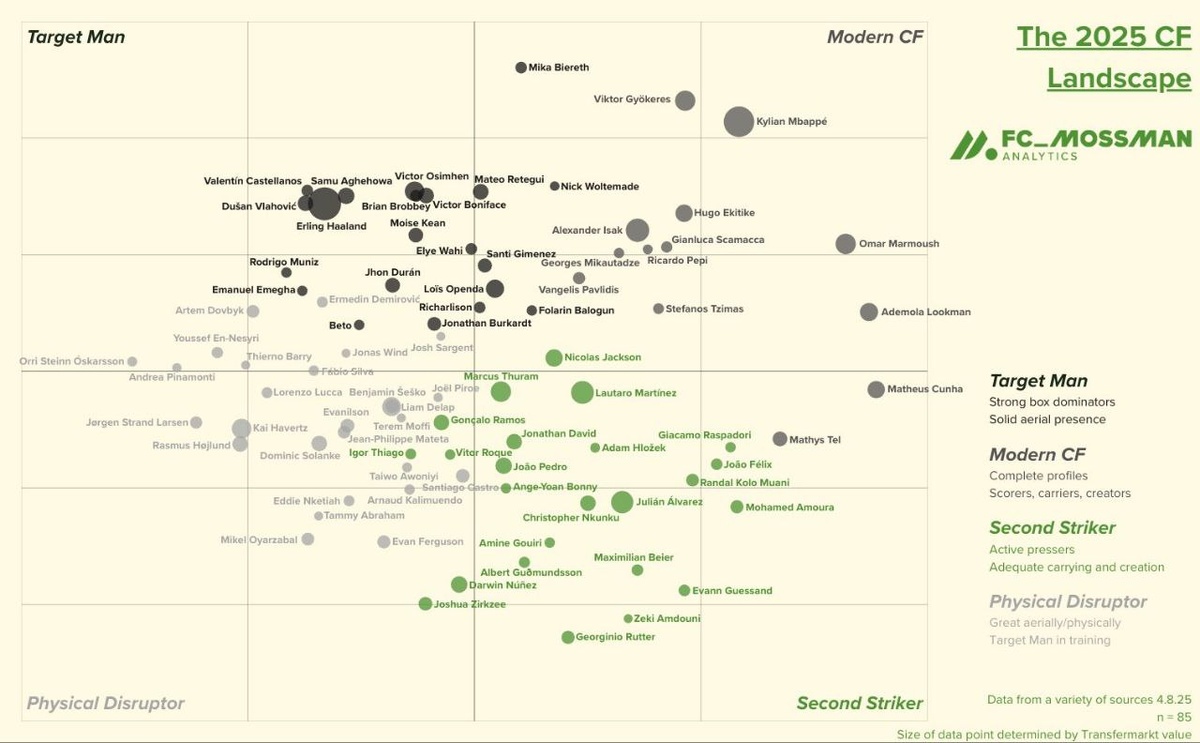 Типы нападающих Европы: кого заберете в свой клуб? 1. Что показывает график Это карта нападающих 2025 года — кто чем силён и какой у него стиль. Все игроки — относительно молодые и ценные. 2. Деления инфографики График делит игроков по стилю на 4 типа: 🔵 Target Man — большие, мощные, борются в штрафной, хороши на втором этаже 🔵 Modern CF — современные нападающие, которые умеют всё: забивать, тащить мяч, создавать моменты. 🔵 Second Striker — вторые нападающие: активны в прессинге, создают моменты. 🔵 Physical Disruptor — "сырые" физически нападающие, не до конца развитые как будущие Target Man. 3. Как выбрали игроков — Моложе 28 лет — Стоимость от €15 млн (по Transfermarkt) — Играл хотя бы 800 минут за сезон — Есть продвинутая статистика по игре 4. Как оценивали Для каждого игрока рассчитали "баллы способностей" — показатели, переведённые в рейтинги от 0 до 100 (z-оценки): ➡️ Box Domination — как часто и опасно нападающий работает в штрафной ➡️ Conversion — как хорошо превра