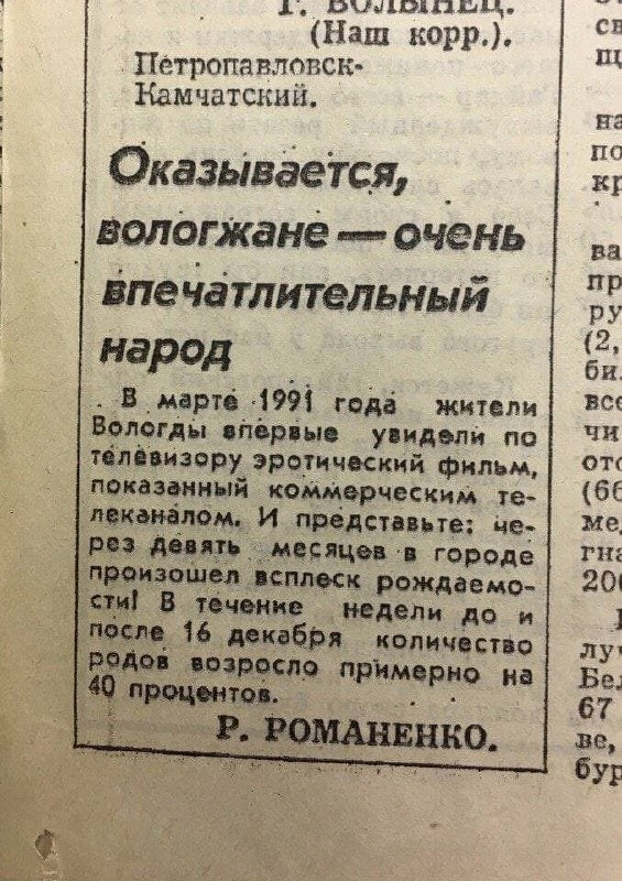 🗣Россияне выяснили, как поднять рождаемость По словам Р. Романенко, в 1991 году жителям Вологды по телевизору показали эротический фильм. В связи с чем вологжане были настолько удивлены, что уже через 9 месяцев произошел всплеск рождаемости. ~ Выпуск газеты "Комсомольская правда", 7 января 1992 год. #Россия #смешно 🏛History_detail. Подписаться