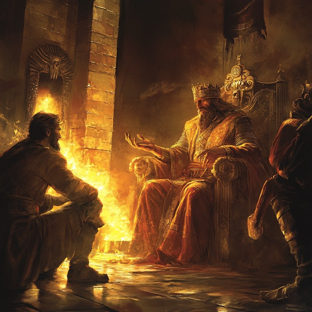 Создано на основе запроса: A warm, illustrated scene showing a majestic king on a golden throne extending mercy to a servant, radiant light around the throne. The servant is kneeling, overwhelmed with gratitude. In the background or side panel, the same servant angrily grabs another man over a small pouch of coins. A warm fireplace near the king symbolizes the melting of bitterness. A shadowy dungeon appears far away, dimly lit. Emotive, storytelling illustration, soft painterly style, golden and earthy tones, presentation-friendly. --- Автоперевод: Теплая, иллюстрированная сцена, показывающая величественного короля на золотом троне, распространяющуюся на слугу, сияющий свет вокруг трона. Как тебе такое изображение? 🤔 https://dzen.ru/id/65c0c65c86e4f837c27b24d7 #ИИ #AI #нейросеть #midjourney #art