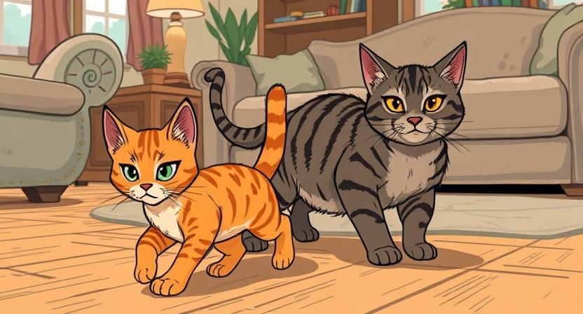 Меня зовут Пирожок, я рыжий, компактный и, как говорит Наташа, "очень милый". Но не дайте себя обмануть моим размерам и цвету шерсти — я тут главный стратег. А вот Бандит, мой серо-коричневый напарник с чёрными полосками, больше похож на шкаф с усами. Он думает, что он босс, потому что весит, как два меня, но мы оба знаем правду: без моего гениального плана он бы до сих пор спал на подоконнике, мечтая о недосягаемой колбасе. Наши хозяйки — Наташа и Катя, две сестры, которые думают, что это они управляют домом. Наташе 40, она старшая, любит порядок и вечно ворчит, что мы "шерстим" её чёрные платья. Катя, младшая, ей 35, — более мягкий вариант: она обожает нас тискать и называет "своими бубунечками". Ну, терпимо, пока она кормит нас вкусняшками. Но сегодня у нас с Бандитом миссия поважнее: мы узнали, что в холодильнике появилась новая банка тунца. И мы, кошачья элита, не можем позволить, чтобы эта добыча досталась людям. Я — Бандит, гроза этого дома. Посмотрите на меня: полоски, как у ти