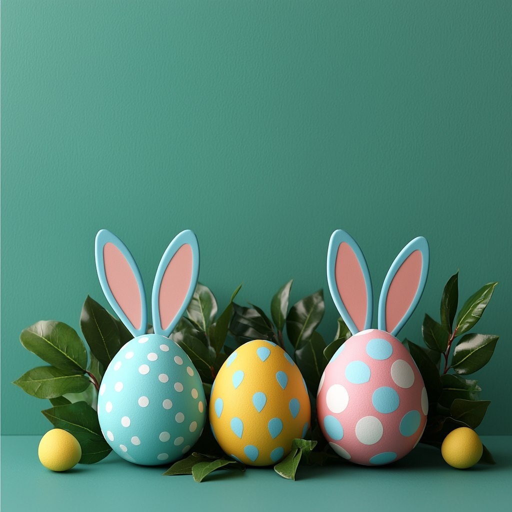 Создано на основе запроса: Bright minimalist composition of cartoonish Easter eggs and bunny ears, bold green studio background.