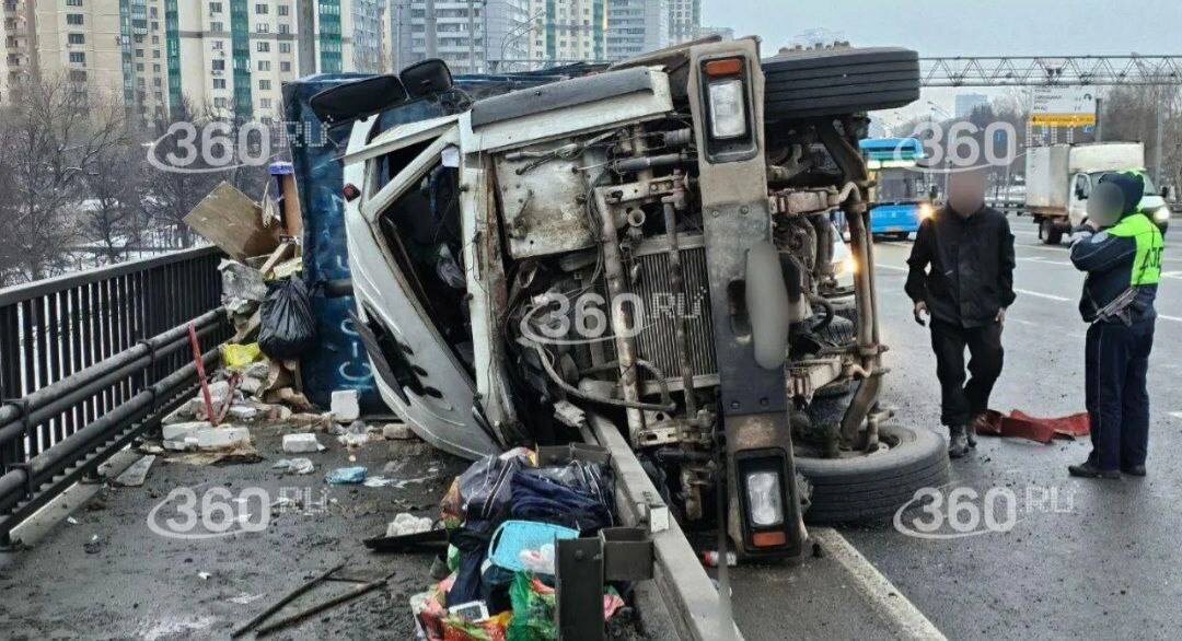 🚚 Самосвал со строительным мусором перевернулся на мосту на севере Москвы.