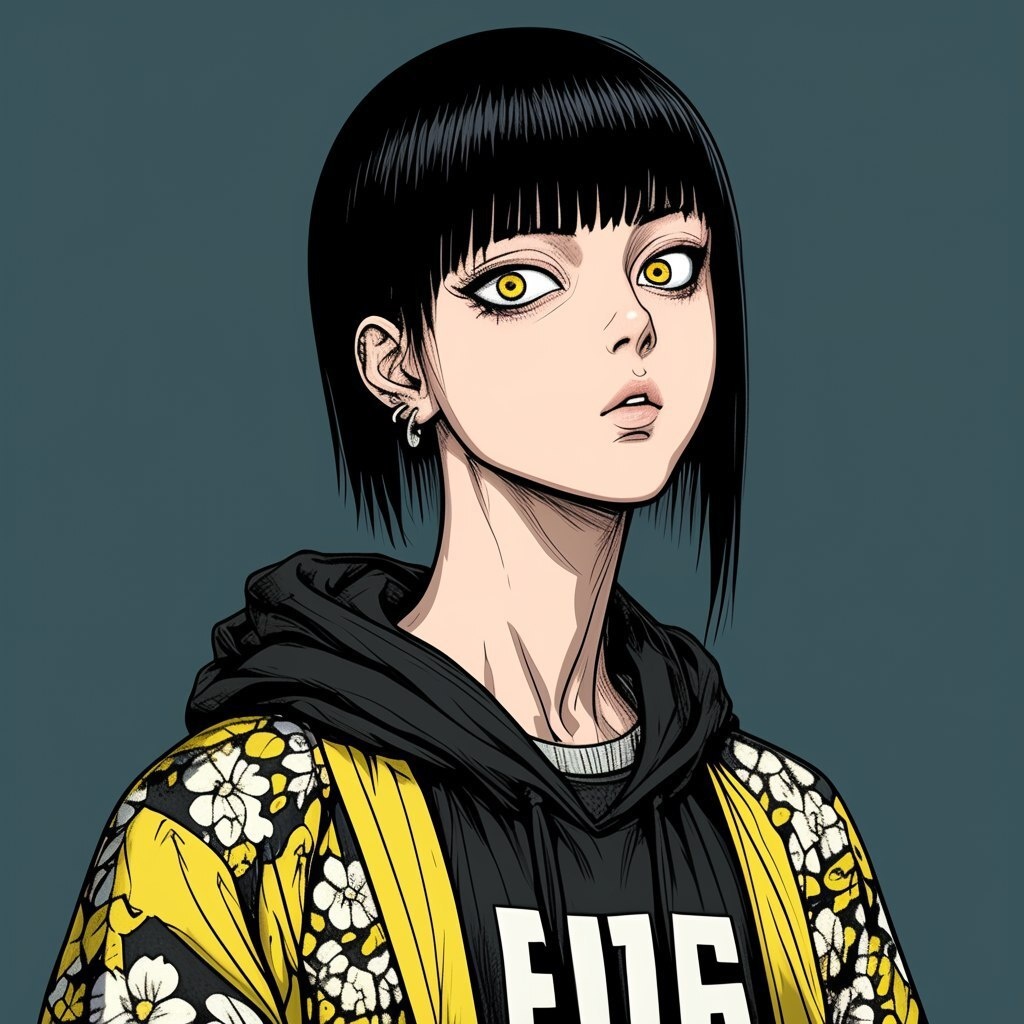 Создано на основе запроса: Profile three-quarter pose female teenager, colorful horror manga style, short bob cut with neon teal and black streaks, piercing golden eyes, wearing a dark green haori with white floral patterns over a grey hoodie, solid dark cyan background, ultra-detailed ink lines, high contrast --- Автоперевод: Профиль трех четвертях позы подростков, красочный стиль манги ужасов, короткий боб с неоновым бирюзовым и черным Классно вышло? 🤔 https://dzen.ru/id/65c0c65c86e4f837c27b24d7 #ИИ #AI #нейросеть #midjourney #art