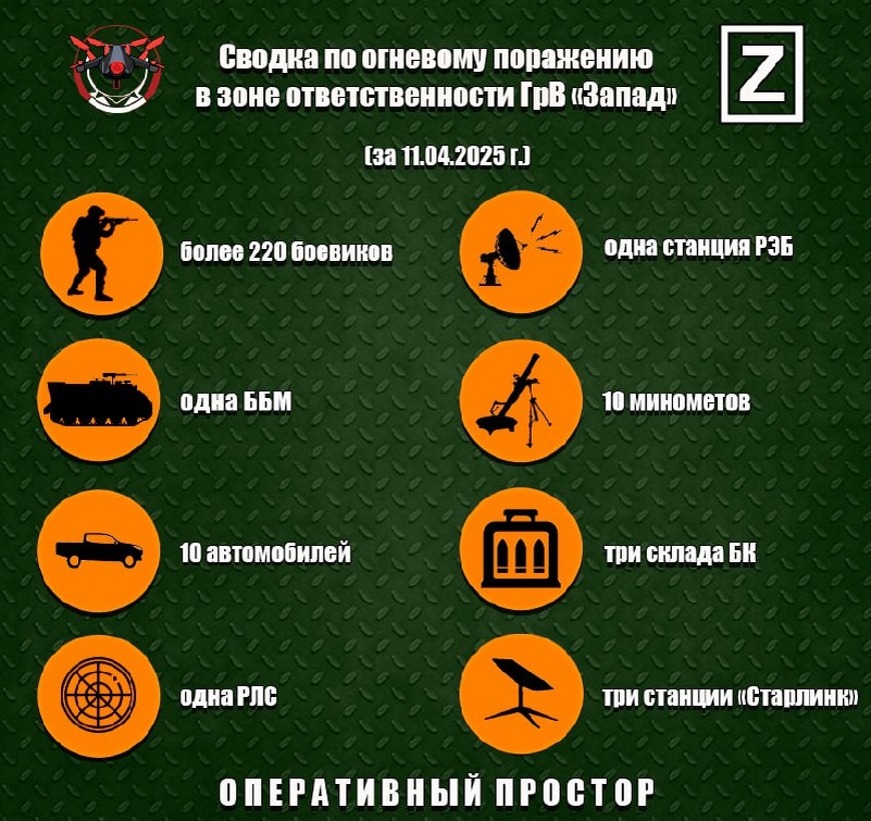 🇷🇺Сводка по огневому поражению в зоне ответственности ГрВ «Запад» за 11.04.2025 г. Нанесено огневое поражение подразделениям противника в районах населенных пунктов Каменка, Купянск, Боровая, Новое, Макеевка, Ямполь и Кировск. Уничтожены личный состав и техника противника. Оперативный простор