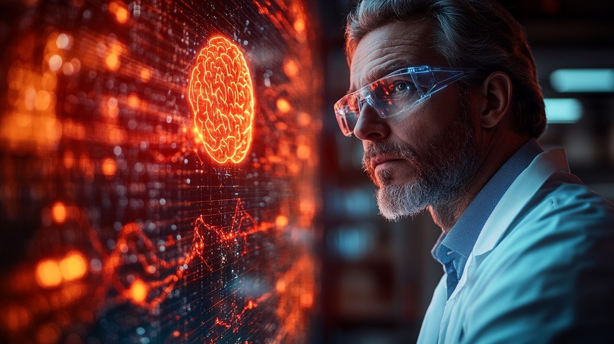 Создано на основе запроса: white male scientist (50s-60s), wearing lab coat, standing beside a floating holographic display showing sine