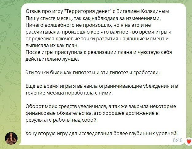 Лирмак Елена: Отзыв про игру "Территория денег" с Виталием Колядиным. Пишу спустя месяц, так как наблюдала за изменениями. Ничего волшебного не произошло, но я на это и не рассчитывала, произошло кое что важное - во время игры я определила ключевые точки развития на данные момент и выписала их как план. После игры приступила к реализации плана и чувствую себя действительно лучше. Эти точки были как гипотезы и эти гипотезы сработали. Еще во время игры я выявила ограничивающие убеждения и в течение месяца поработала с ними. Оборот моих средств увеличился, а так же закрыла некоторые финансовые обязательства, это хорошее достижение в результате работы над собой. Хочу вторую игру для исследования более глубинных уровней! https://v-kolyadin.ru/territoria_deneg