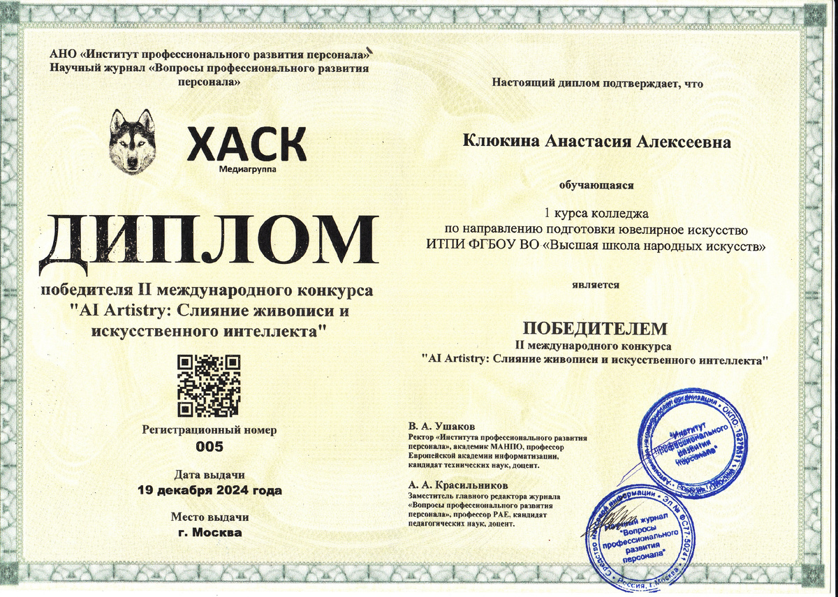 19 декабря 2024 года состоялся второй международный конкурс "AI Artistry: Слияние живописи и искусственного интеллекта", который собрал талантливых художников и экспертов из разных уголков мира. Основная цель мероприятия заключалась в демонстрации взаимодействия новых технологий с искусством и создании новых форм самовыражения. Участие и впечатляющие работы Участники конкурса использовали нейросети для создания своих произведений, которые поражали жюри оригинальностью и яркостью. Особенно выделялась работа Клюкиной Анастасии Алексеевны, студентки первого курса колледжа по направлению подготовки "Ювелирное искусство" ИТПИ ФГБОУ ВО «Высшая школа народных искусств». Ее работа была признана победителем конкурса, несмотря на сильную конкуренцию. Призеры конкурса Помимо Анастасии, призами были отмечены работы других талантливых художников, которые также использовали нейросети для воплощения своих идей. Их вклад в конкурс демонстрирует многообразие творческого подхода и возможности, открывающ