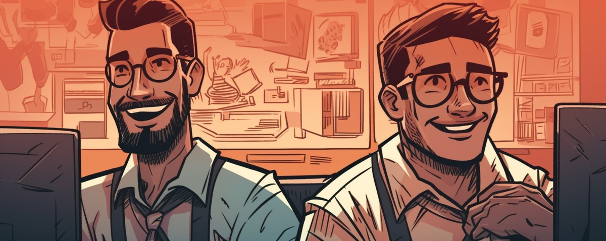 Создано на основе запроса: Two happy office employees. The style should feature bold lines, exaggerated features, exaggerated expression, and bright, simple colors to enhance the comic-book aesthetic. --- Автоперевод: Два работника счастливых офисов. Отлично вышло? 🤔 https://dzen.ru/id/65c0c65c86e4f837c27b24d7 #ИИ #AI #нейросеть #midjourney #art