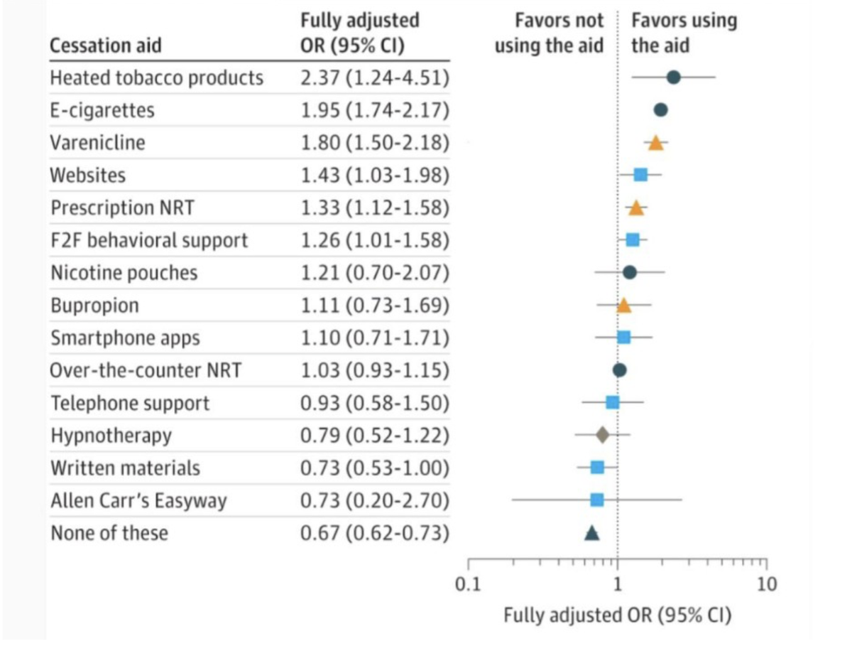 #как_надо_делать график, отображающий оценки предикторов в регрессионной модели? В статье S.E.Jackson et al. “Prevalence of Popular Smoking Cessation Aids in England and Associations With Quit Success” для оценки связи между использованием различных средств, помогающих бросить курить, и шансами успешного отказа от курения был использован метод бинарной логистической регрессии. В результате для каждого средства получено отношение шансов с 95% доверительным интервалом. Авторы построили диаграмму Error bars plot (столбики ошибок). Это универсальный и наглядный способ показать несколько однородных параметров с доверительными интервалами (ДИ). Такими параметрами могут быть средние или процентные доли, их разности, относительный риск (RR), отношение шансов (OR), отношение угроз (HR) и другие. Иногда чёрточки на графике могут соответствовать не только границам ДИ, но и размаху (min-max), ±SD, ±SE, определенному числу SD (например, -2SD, +2SD), но эти варианты встречаются сильно реже. Подобный