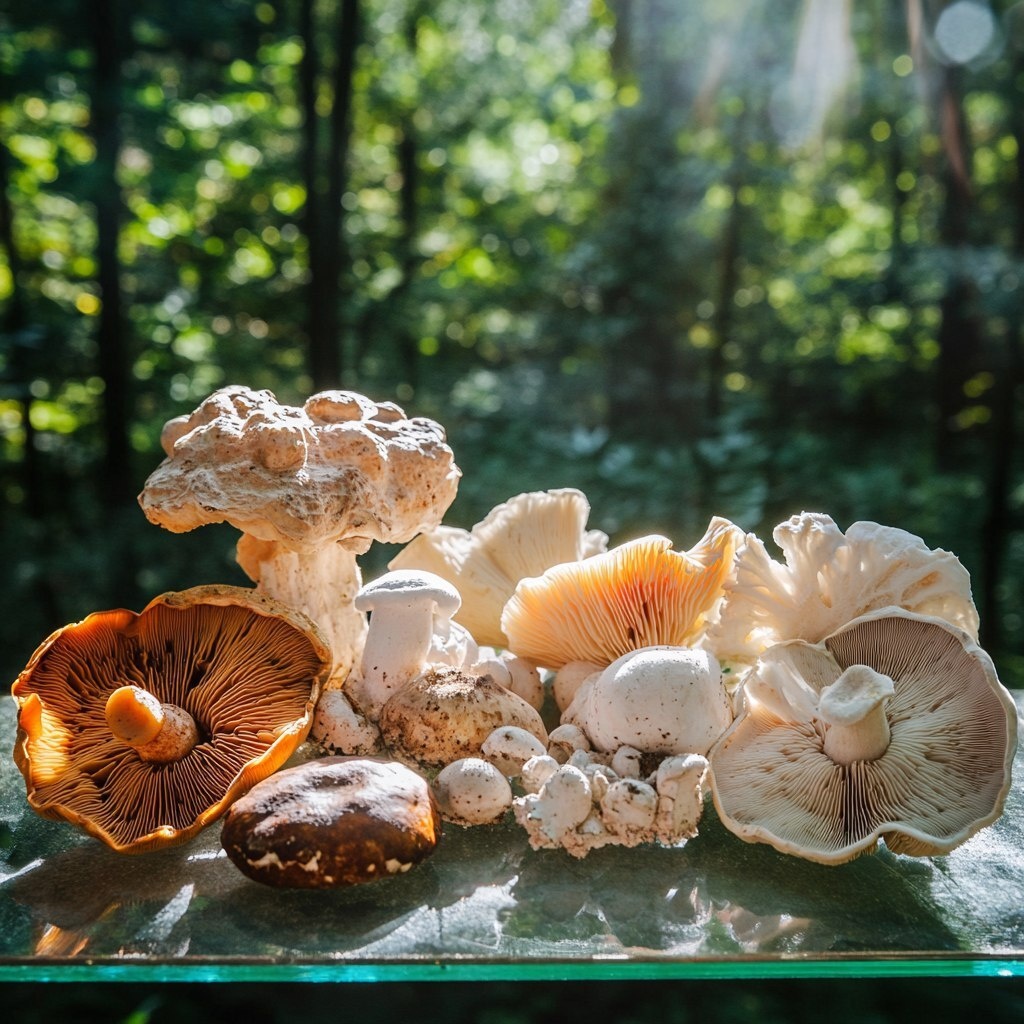 Создано на основе запроса: Close-up of various medicinal mushrooms. The mushrooms are clean without traces of earth. Among the mushrooms are reishi, lion's mane, turkey tail and cordyceps, which differ in color and texture. Mushrooms are lying on a transparent glass table in the forest. In the background is a lush green forest. Bright sunlight lighting