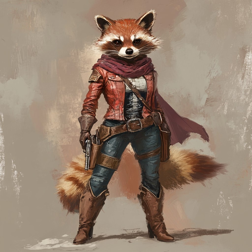 Создано на основе запроса: western fantasy character concept, female outlaw raccoon, she is a red raccoon similar to a red panda, she wears a leather cowboy duster and chaps, she is a bandit, rogue pose --- Автоперевод: Концепция западного фэнтезийного персонажа, женская Outlaw еновая енота, она красный енот, похожий на красную панду, она носит кожаный ковбойский тряпкий Отлично получилось? 🤔 https://dzen.ru/id/65c0c65c86e4f837c27b24d7 #ИИ #AI #нейросеть #midjourney #art