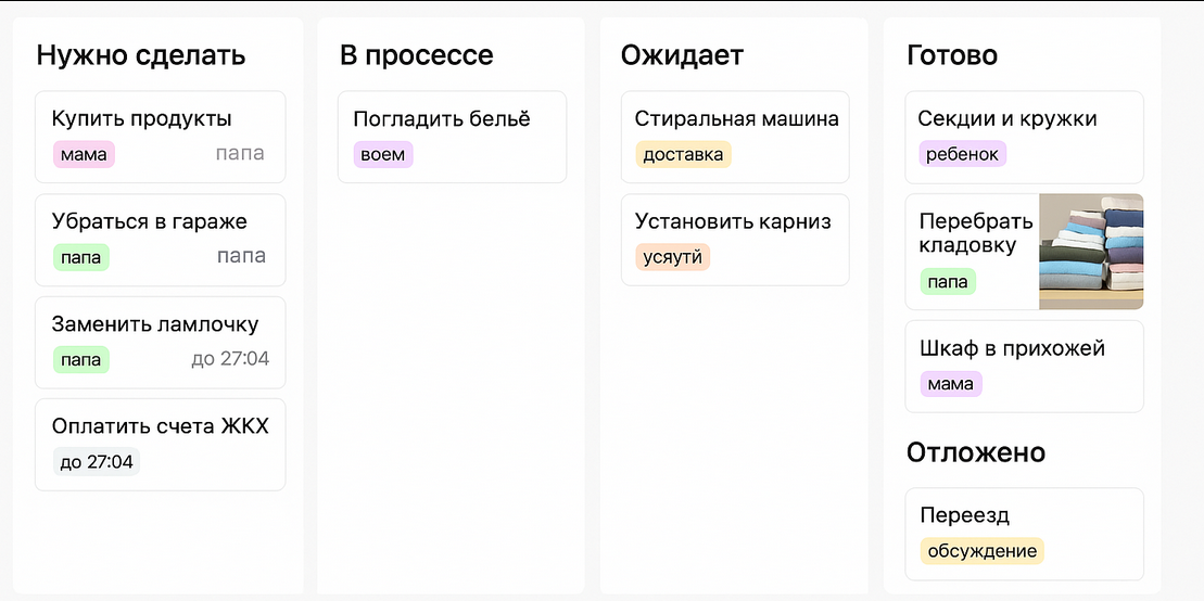 Планировать бизнес-проекты — это важно. Но что насчёт повседневных дел, которые отнимают не меньше сил? Покупки, уборка, ремонт, оплата счетов, кружки детей, семейные поездки — всё это тоже нужно координировать. А если в доме больше одного человека — без структуры быстро начинается бардак. Канбан-доска — отличный способ организовать быт. Она помогает не только видеть, кто что делает, но и распределить нагрузку честно и по-человечески. Колонки: Подходит для: текущих дел по дому, без привязки к конкретным ролям. Можно добавлять теги: «мама», «папа», «ребёнок», «всем». Колонки: Плюс: позволяет распределить зоны ответственности и отслеживать, что давно не трогали. Колонки: Подходит для: закупок продуктов, мебели, одежды, крупных покупок. Колонки: Плюс: удобно видеть нагрузку и поддерживать школьный/внеклассный график. Колонки: Примеры: отпуск, переезд, дача, день рождения, новогодние праздники и пр. В Strive можно: Домашние и семейные дела — это не менее важный проект, чем работа.