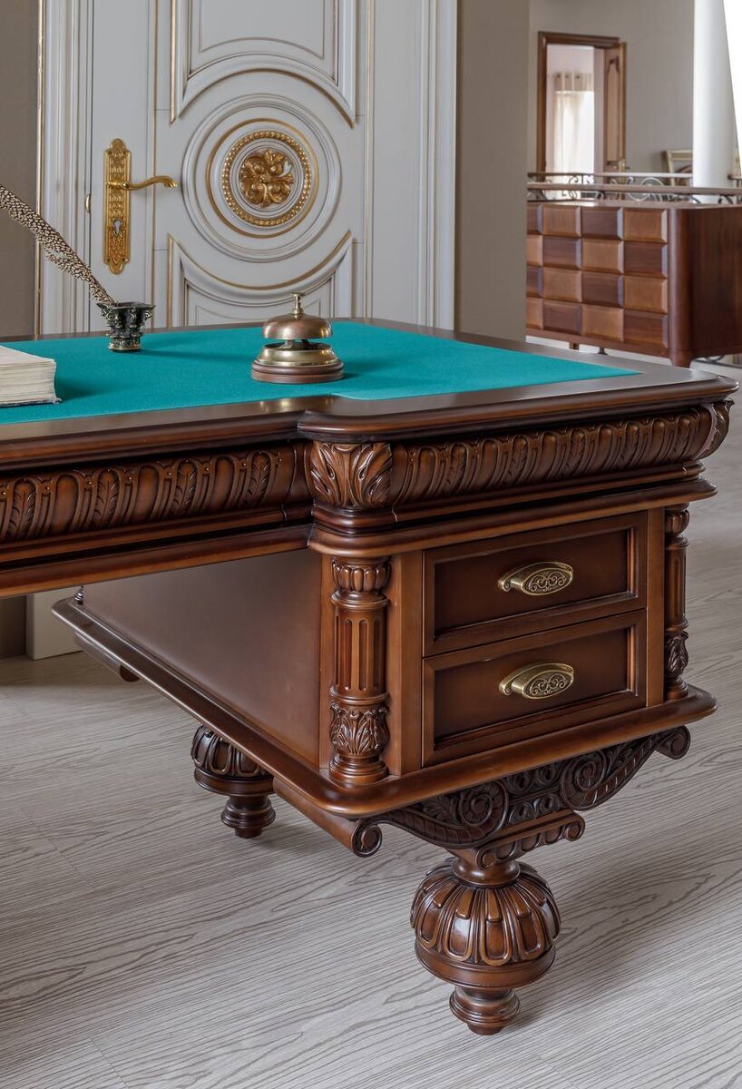 Этот классический рабочий стол из ольхи Он сочетает в себе не только высокий визуальный эффект, но и доработан нами с учетом современных принципов эргономики и удобства. Множество небольших интегрированных в резные элементы ящиков, роскошное сукно сочного цвета и натуральное дерево! За таким столом Вам не захочется отвлекаться на гаджеты, и даже может появиться желание взять в руки рукописное перо 🪶