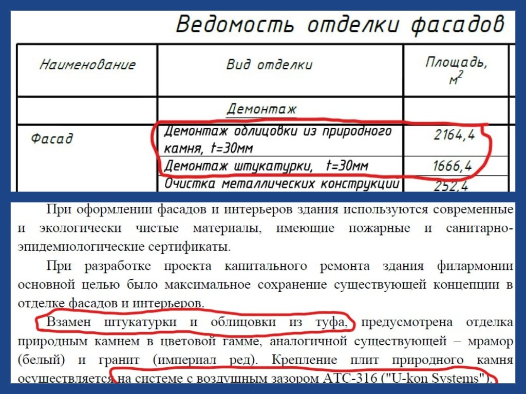 Согласно документам, строение ждет установка вентилируемого фасада, а также демонтаж существующей облицовки и слоя штукатурки. По словам краеведа, даже оригинальные элементы интерьера и фасада будут уничтожены. Известно, что проект ремонта филармонии почти за 600 миллионов рублей был разработан компанией «Жилстройпроект» и подписан директором И.А. Батаговым и главным инженером проекта А.О. Кулешовым. На эту госзакупку краевед Геннадий Крольман наткнулся случайно после проекта капитального ремонта Донской государственной публичной библиотеки за 2,17 млрд рублей. Капремонт филармонии тоже нуждается в проверке — Участь примерно похожая, как и у Публички будет. Рабочие будут сбивать натуральный камень с фасада, его ждет полная замена и вентилируемый фасад. По интерьерам все относительно сохраняются, но что-то тоже будут сбивать, будут все абсолютно новые двери — тоже это довольно странно, потому что сейчас двери выглядят нормально. А более того, на них сохранились оригинальные или стилизов