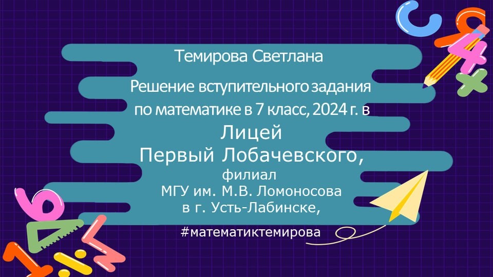 Как обещала ранее, записала разбор вступительного экзамена по математике в 7 класс Лицея Первый Лобачевского, филиал МГУ им. М.В. Лобачевского в г. Усть-Лабинске (2024 г.) . Посмотреть запись можно по ссылке в вконтакте или в ютубе