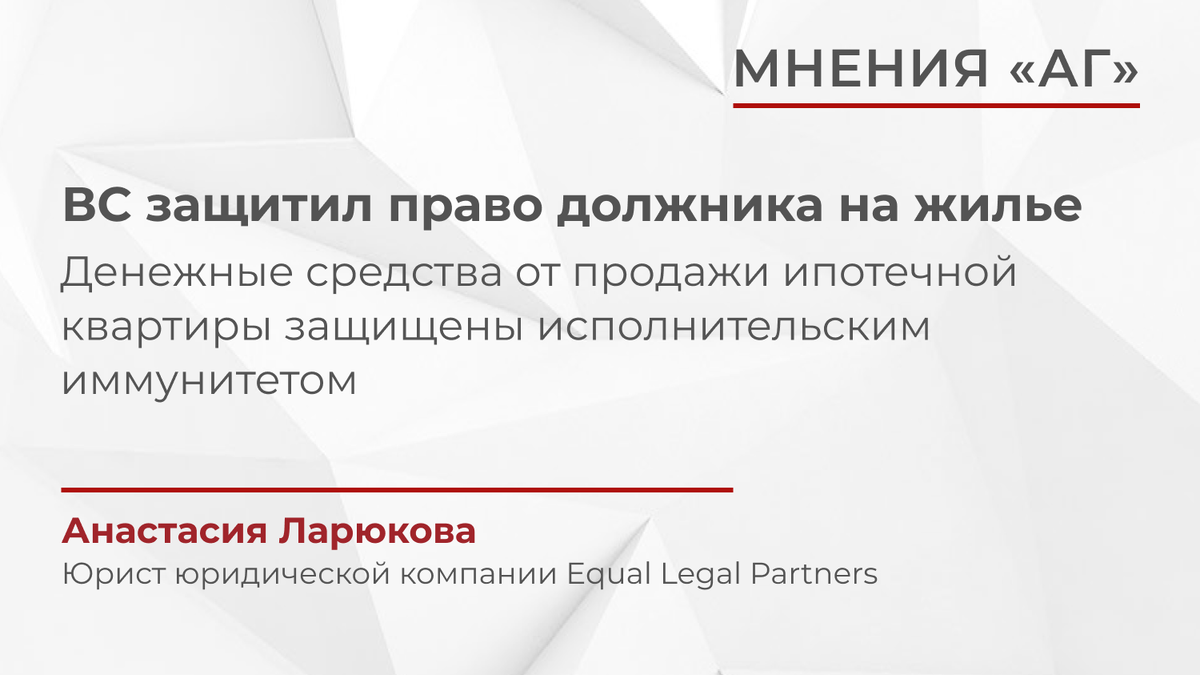 Юрист юридической компании Equal Legal Partners Анастасия Ларюкова о позиции ВС РФ, защитившего права и законные интересы физлица-банкрота путем признания за ним права на получение денежных средств, оставшихся после реализации единственного жилья должника.