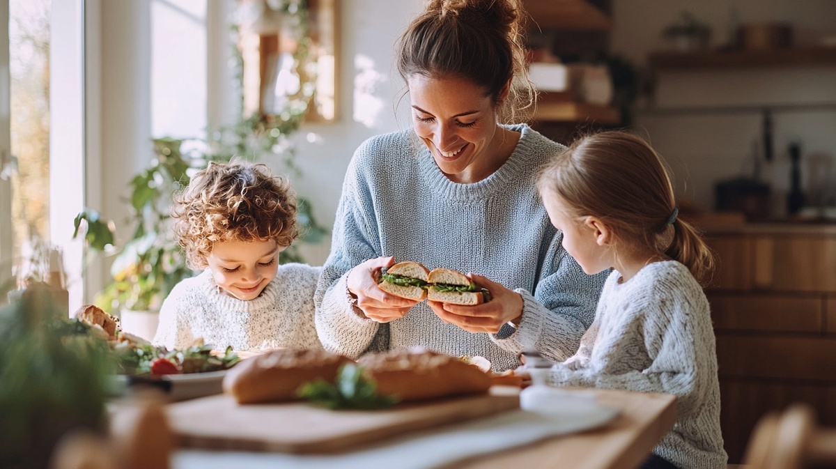 Создано на основе запроса: wide cinematic shot of a cozy home dining room, a mother handing a half baguette sandwich to each of her two