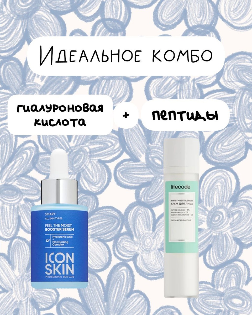 Комбинация гиалуроновой сыворотки и крема с пептидами — это не просто модный уход, а настоящее спасение, если кожа выглядит уставшей, обезвоженной или теряет упругость Почему это работает? Гиалуроновая кислота: — мгновенно увлажняет, притягивая влагу как магнит — разглаживает мелкие морщины — убирает ощущение стянутости Пептиды: — запускают синтез коллагена и эластина — повышают упругость — «учат» кожу быть молодой Вместе они дают коже и то, что нужно ей здесь и сейчас (влага), и то, что сохранит её в будущем (антиэйдж эффект) Кому подойдёт это комбо? ✔ У вас сухая или чувствительная кожа, которой всегда не хватает увлажнения ✔ Уже есть первые морщинки, и хочется не просто «маскировать», а работать на результат ✔ Хочется увлажнения без жирности, особенно если кожа комбинированная или склонна к высыпаниям Как использовать правильно? 1. Умойтесь и нанесите тоник 2. На влажную кожу — гиалуроновую сыворотку 3. Подождите пару минут и сверху пептидный крем 4. Не забудьте про SPF утром,