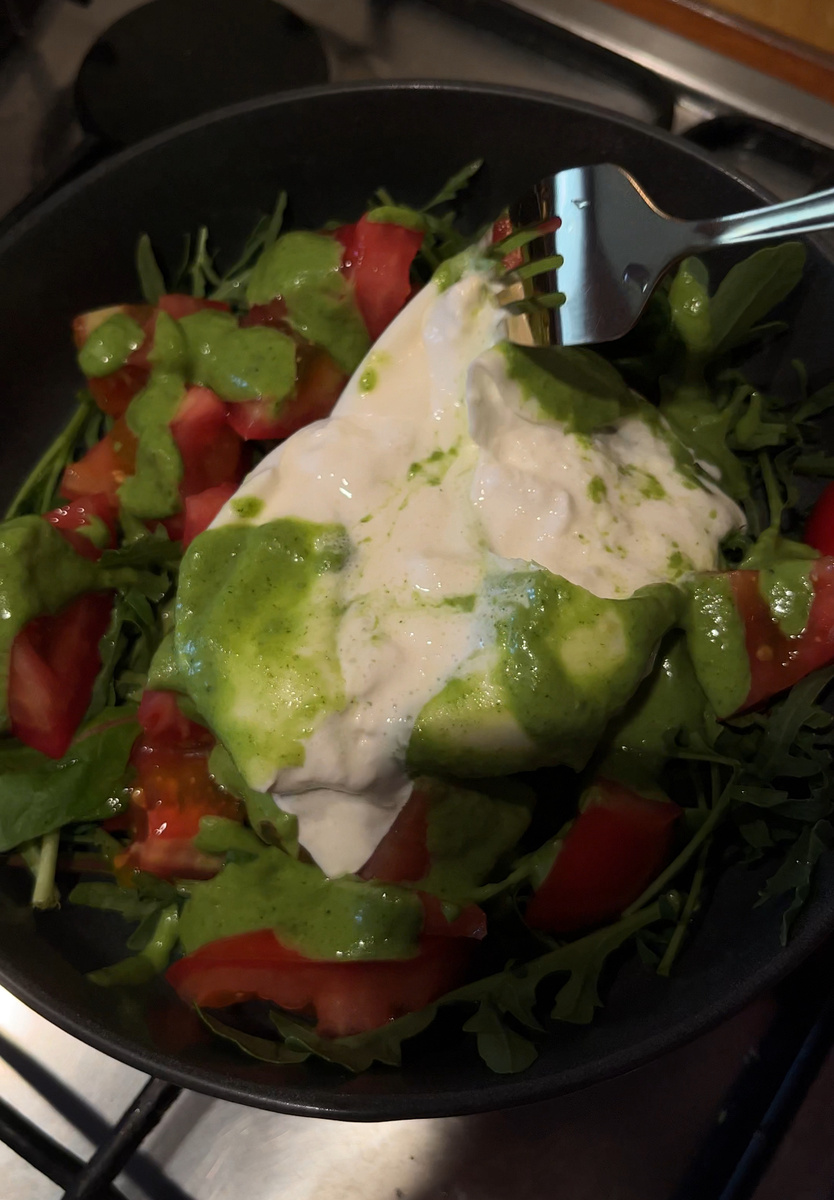 Ингредиенты: Готовим соус песто. Промываем базилик и подсушиваем бумажным полотенцем. Чистим чеснок. Кладем базилик и чеснок в блендер - взбиваем. Добавляем мелко нарезанный сыр, кедровые орешки, оливковое масло и взбиваем ещё раз. В конце добавляем соль и сок лайма - перемешиваем. Выкладываем в тарелку салат и нарезанные томаты. Сверху кладем буррату и поливаем соусом песто. Приятного аппетита🫶 * Я очень люблю песто, поэтому добавляю его везде и много✨