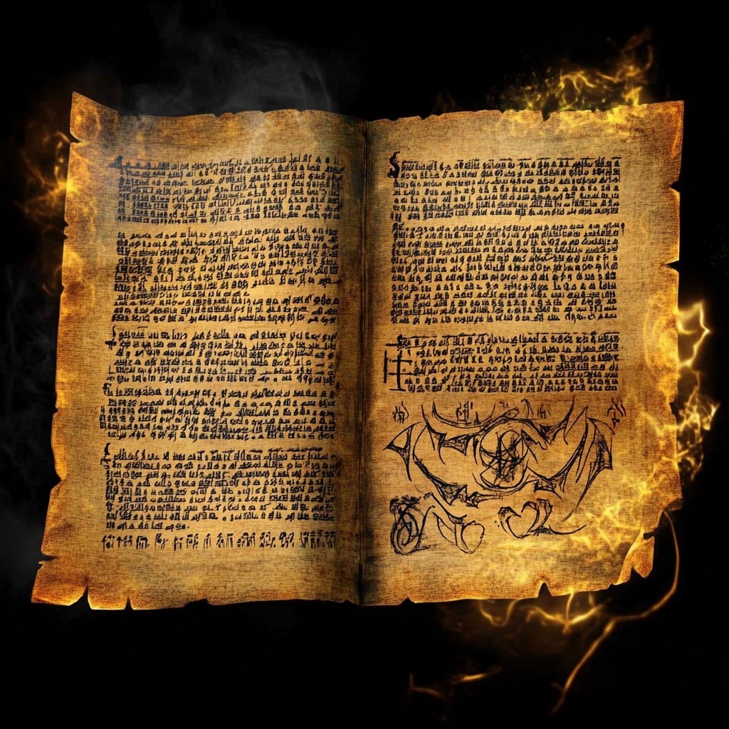 Создано на основе запроса: extremely detailed and realistic, total black background, ancient scroll, ancient text, old scroll surounded by yellow mist