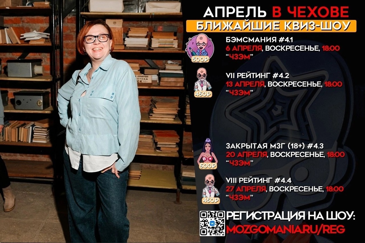 ✨ Анонс от клуба "Умного Отдыха" и квиз-шоу "МозгоМания В АПРЕЛЕ у нас 4 встречи (2 тематики и 2 РЕЙТИНГА). ⏳Сбор команд с 17:30. Играем с 18:00. 👉6 апреля у нас БЭМСМания (подарочное, авторское и тематическое). 25 команд в деле. Розыгрыш непереходящего кубка. 💰 500 ₽ с человека 👉13 апреля у нас VII РЕЙТИНГ ( борьба за кубки), рассадка по лигам. Введём в работу 3 зал. 💰450 ₽ с человека. 👉20 апреля у нас Закрытая МЗГ ( только для взрослых и смелых команд).Тематическо-эротическое квиз-шоу. Розыгрыш непереходящего кубка. 💰500 ₽ с человека 👉27 апреля у нас VIII РЕЙТИНГ ( борьба за кубки), рассадка по лигам. Введём в работу 3 зал. 💰450 ₽ с человека. ТУТ регистрация 👉 https://mozgomania.ru/reg 🏢 Энергомаш Чехов-ЧЗЭМ 📍 г. Чехов, ул. Гагарина, д. 1 (2 этаж) ✅ Мероприятия Чехов https://dzen.ru/id/66cc4b48e9ef144699238a51 http://vk.com/chekhov_events http://dzen.ru/chekhov_events
