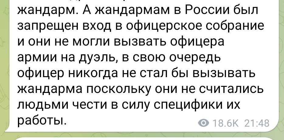 По просьбе подписчика комментирую ахинею, опубликованную в каком-то телеграм-канале. Прежде всего, вход в офицерское собрание жандармам не был запрещен. Впрочем, что они там забыли? В него, в принципе, допускались только офицеры части или гарнизона, которые это офицерское собрание и сформировали. Прийти туда без приглашения - моветон. Поэтому ни жандармы, ни офицеры других частей туда не приходили не из-за мифического запрета, а руководствуясь правилами хорошего тона. Что касается намека на презрение со стороны офицеров к жандармам - это миф, сформированный советской историографией. Жандармский корпус формировался из офицеров действующей армии и количество заявок было огромным. Пройти отбор могли лучшие из лучших. Было бы странно, если бы офицеры внезапно начинали испытывать презрение к своим недавним товарищам по оружию. Это выглядело бы как зависть к более достойным. На дуэли жандармов действительно вызывать было не принято, но по совершенно иной причине, чем та, что указана в пос