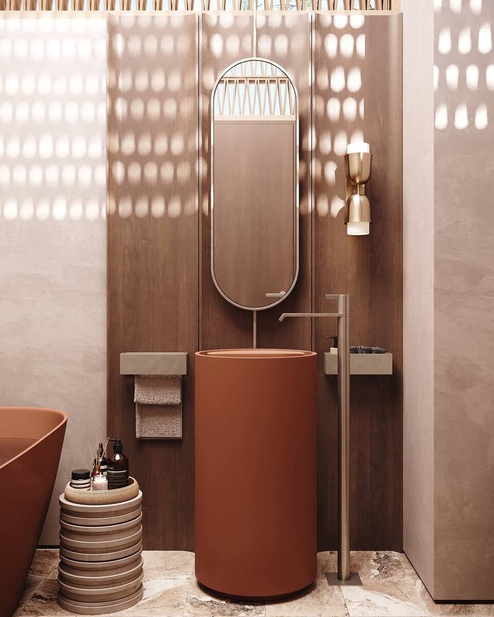 Salini. Песочно-оранжевое сочетание придаёт пространству ощущение благородства и изысканной роскоши. Изделия Salini, выполненные в оттенке RAL 2010 «Сигнальный оранжевый», добавляют проекту характер и органичность. Песчаная стена в сочетании с деревянными панелями подчёркивает гармонию между природными текстурами и современным дизайном. Изделия Salini в проекте: • Пристенная ванна Sofia Wall; • Напольная раковина Armonia Round Top 01; • Унитаз Gemelli; • Биде Gemelli. Хотите заказать или узнать подробнее? ▫️Звоните нам📲 +7(495)120-67-77 #salini #сантехника #bathroom #designbathroom