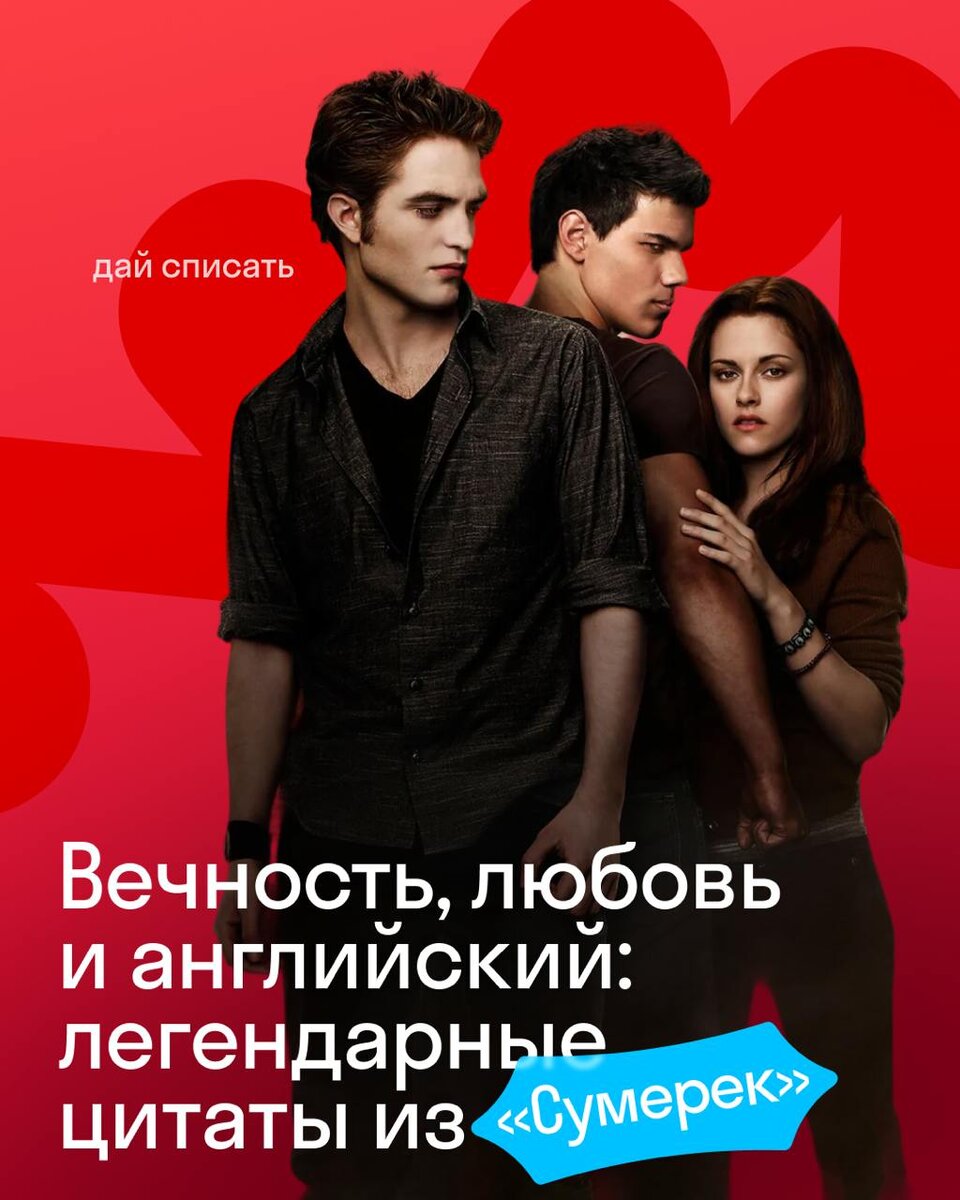 Нам тут ностальгия в глаз попала, и мы решили вспомнить лучшие цитаты из самой популярной вампирской саги. Оказалось, они очень интересные с точки зрения английского. Хоть и немного кринжовые ☕️