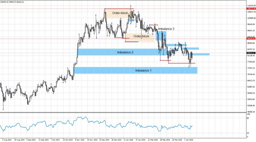 https://basechop.ru/wordpress/?p=38198 Добрый день, уважаемые трейдеры! Биткоин продолжает формирование нового «медвежьего» тренда. Структура остается «медвежьей», цена получила несколько реакций от ближайших «медвежьих» имбалансов, я ожидал падения, и оно произошло. Отработан «бычий» имбаланс (1), который я неоднократно называл целью падения. На мой взгляд, падение не завершится и на этом. После отработки главной цели начался новый откат, но он также, как и все предыдущие, может быть достаточно слабым. Уже из зоны последнего «медвежьего» имбаланса может последовать новое падение. Биткоин упал примерно на 12000$ после того, как Дональд Трамп объявил о взаимных пошлинах для всех стран, и это очень позитивный знак. Он подтверждает правильность сделанных ранее выводов. Я не считаю, что самая «горячая фаза» торговой войны осталась позади. Таким образом, биткоин может упасть гораздо ниже. Главной зоной интереса для продаж выступал «медвежий» имбаланс (3), сформированный 23-24 февраля в зо