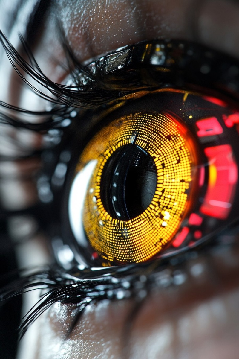 Создано на основе запроса: Extreme close up of the yellow artificial eyes of a extravagant cyberpunk clairvoyant with wearing hi-tech red