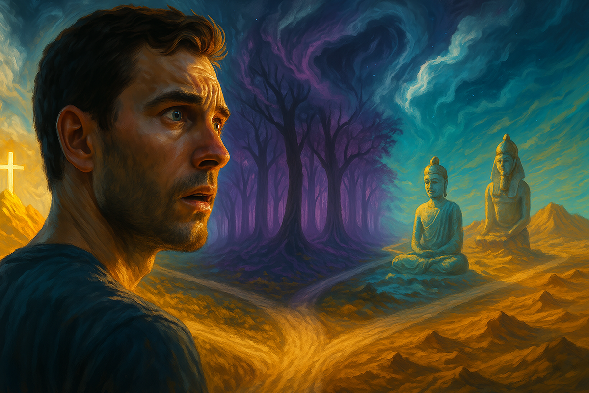 Представьте себе человека, который стоит посреди перекрёстка. Перед ним — множество тропинок. Одни уводят в горы, другие — в лес, третьи — в пустыню. Каждая дорога имеет свои указатели: «Истина тут», «Здесь путь к Богу», «Иди со мной — найдёшь спасение».