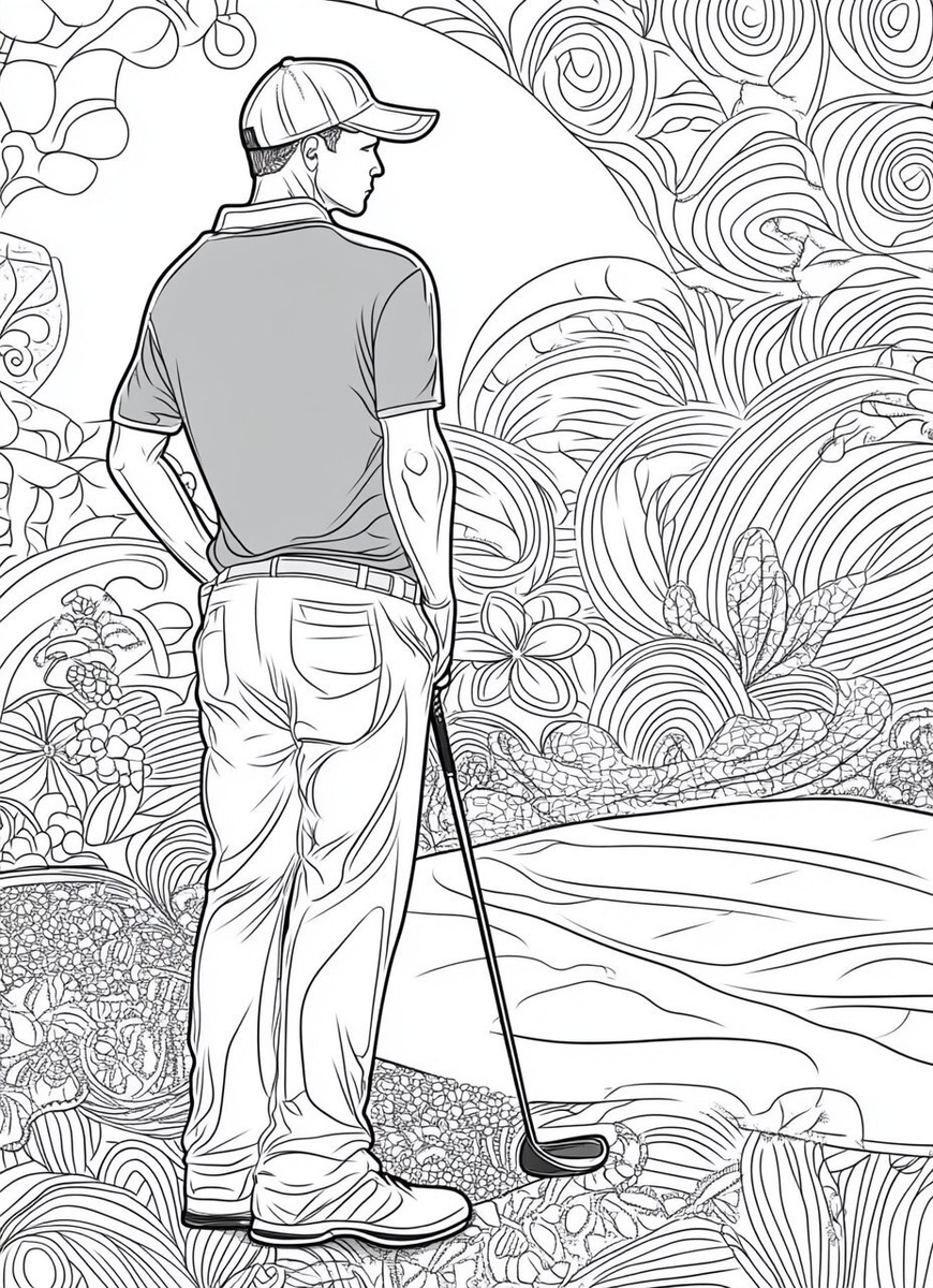 Создано на основе запроса: golf coloring page, player, mandala pattern