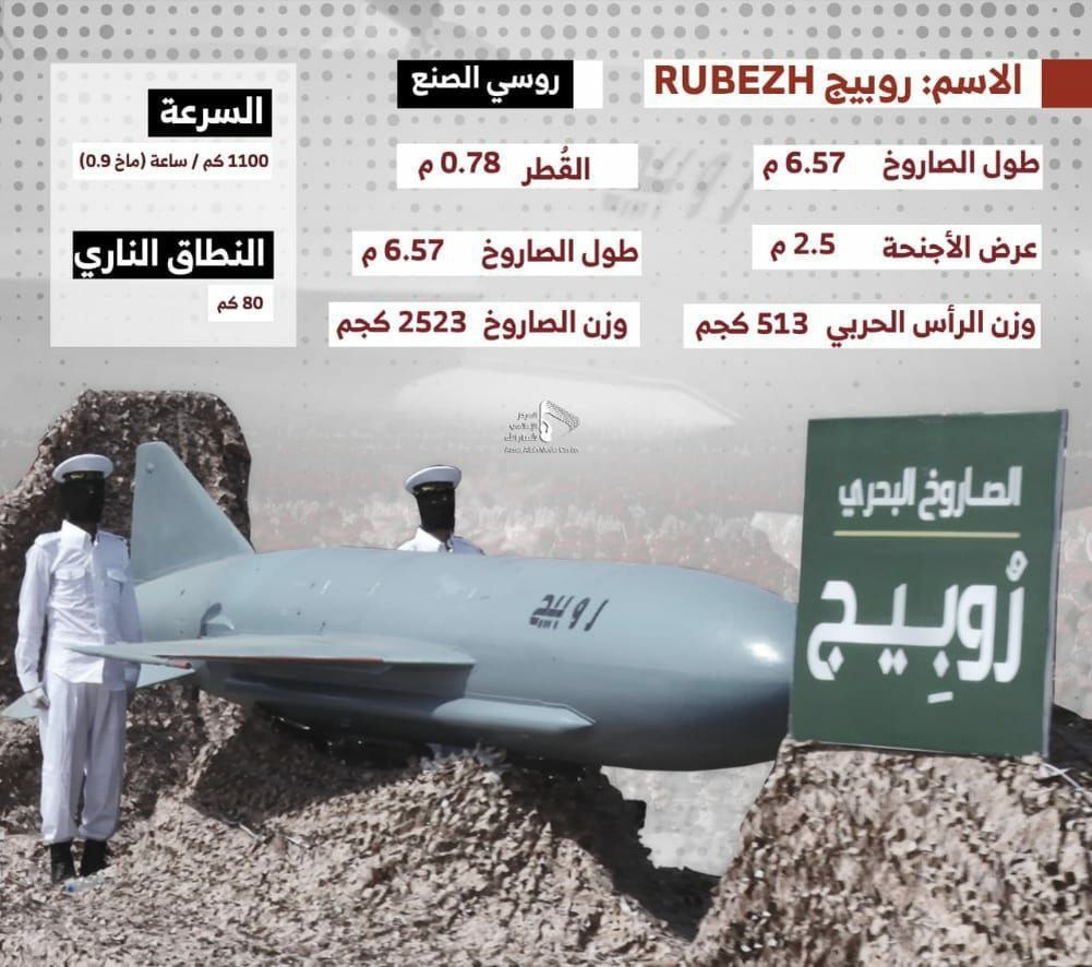 ‼️Ракета "Рубеж", состоящая на вооружении Йеменских вооруженных сил, предназначена для потопления авианосцев и военных кораблей благодаря боевой части массой 513 кг. Её недостаток — малая дальность (не более 100 км), поэтому она применяется против кораблей, приближающихся к побережью. Перехватить её сложно. Это российская противокорабельная ракета, созданная для уничтожения десантных сил противника при попытке высадки на наши берега или острова в Красном море. #Yemen #Russia
