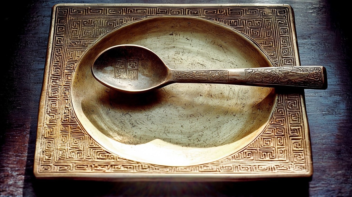 Создано на основе запроса: High-definition Photo ,a south-pointing spoon, carved, resting on a polished bronze plate