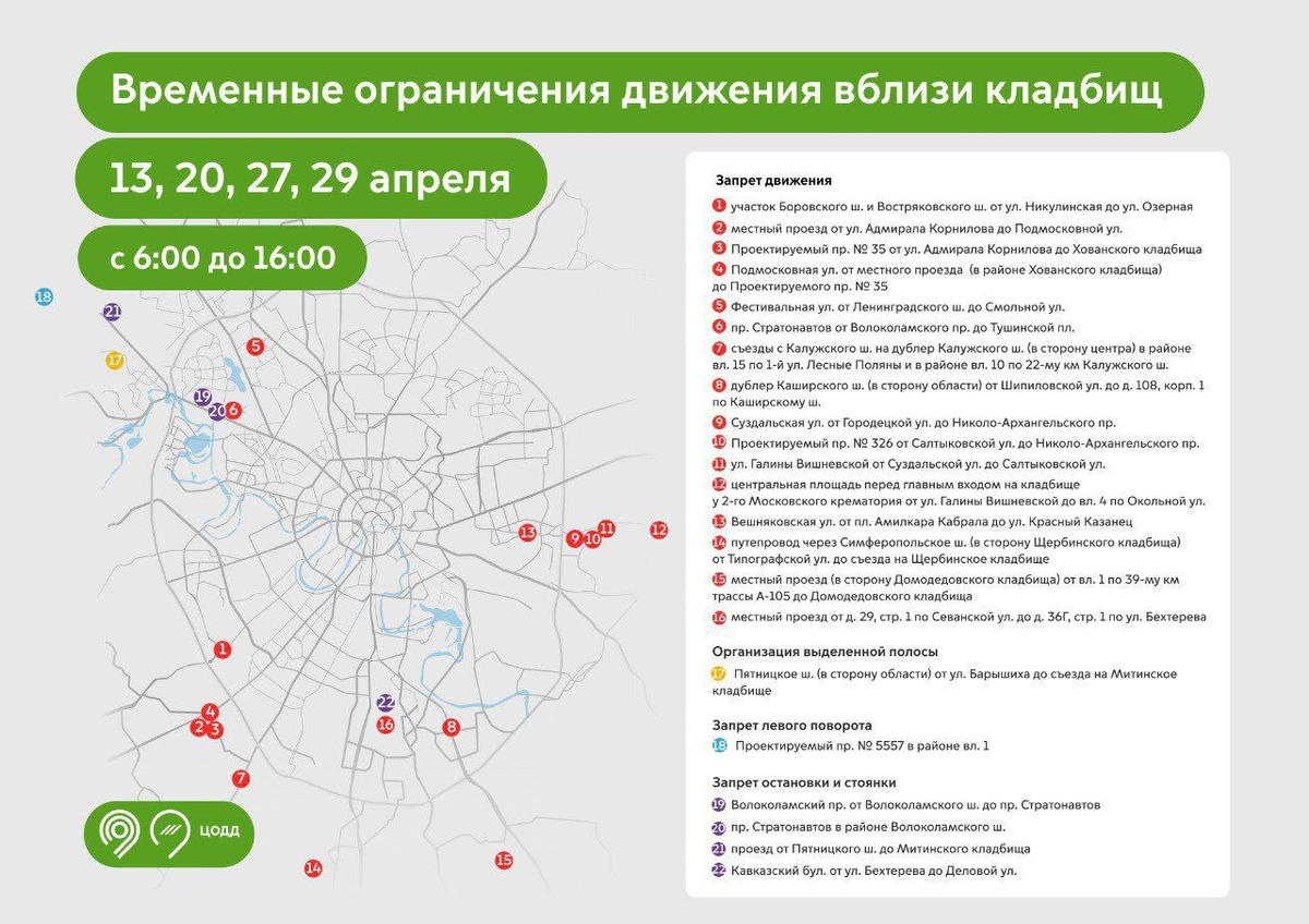 В Москве перекроют некоторые участки дорог в связи с церковными праздниками и массовым посещением кладбищ. Ограничения движения будут действовать 13, 20, 27 и 29 апреля с 6:00 до 16:00. На некоторых участках парковка будет временно запрещена: 13 апреля, в Вербное воскресенье, в Москве организуют бесплатные автобусные маршруты до городских кладбищ. На линии выйдут 454 автобуса, которые будут курсировать с 09:00 до 19:00 по 32 временным маршрутам. Они свяжут крупные кладбища с ближайшими станциями метро и МЦД. Будут доступны новые маршруты с обозначениями: Э, Э-1, Э-2 и Э-3. Также дополнительные бесплатные маршруты наземного транспорта запустят на Пасху (20 апреля), Красную горку (27 апреля) и Радоницу (29 апреля). В эти дни он будет ходить с 08:00 до 19:00. В пасхальную ночь 150 маршрутов автобусов, трамваев и электробусов продлят работу до 03:30, а 18 ночных маршрутов будут действовать по привычному расписанию. С 13 по 27 апреля бесплатный транспорт будет направлен к 14 кладбищам, вкл