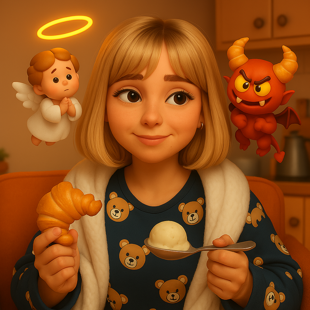 А на левом уже отплясывал Углеводный Кето-Дьявол — с рогами из такого манящего, хрустящего теста и просто умопомрачительным ароматом. С глазами, как в страшилках из детства.