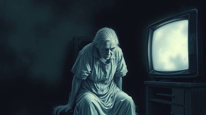 Поднялся — взглянул снова. Лица больше нет. За стеклом пусто. Но... в коридоре теперь кто-то стоит. Фигура. Худая, согнутая. В длинной ночной рубашке, белой, почти светящейся в темноте. Стоит спиной. А потом...