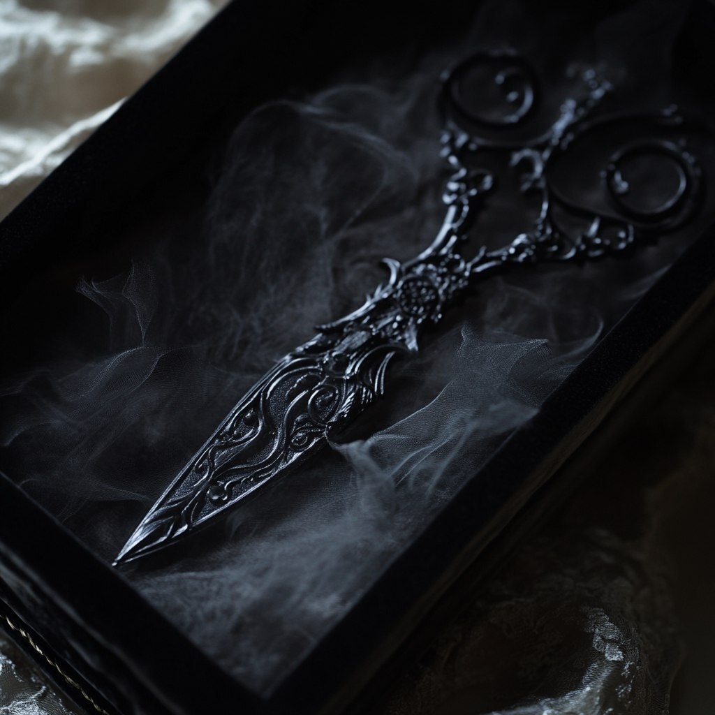 Создано на основе запроса: Black scissors, creepy and elegant, shrouded in black mist, laying in a velvet box, maigcal, laying in a velvet