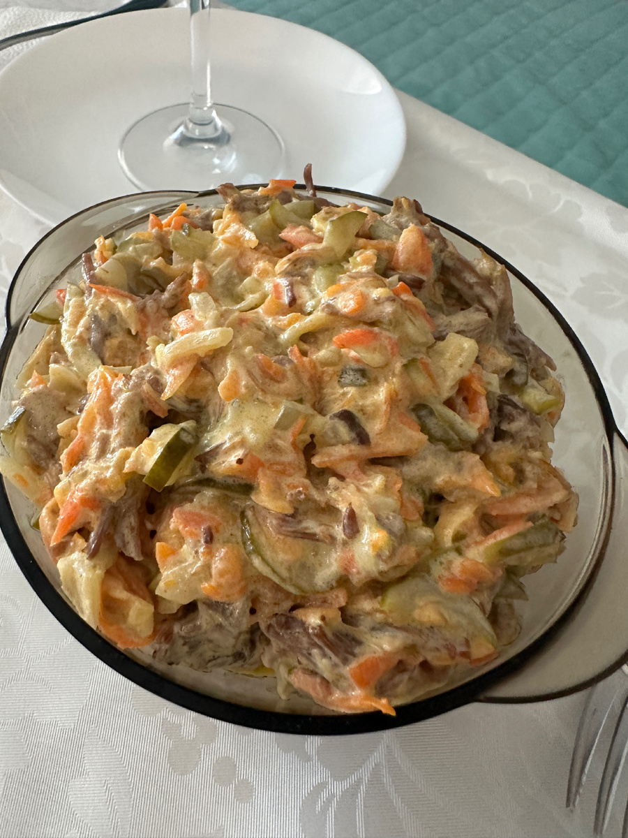 1.Салат Обжорка Салат «Обжорка» — любимое блюдо многих россиян благодаря своему насыщенному вкусу и простоте приготовления. Этот сытный салат быстро завоевывает сердца любителей вкусно покушать и идеально подходит для праздничного стола или семейного ужина. Название салата говорит само за себя: «Обжорка». Оно отражает основную особенность блюда — оно настолько вкусное и аппетитное, что хочется съесть больше, чем положено. Ингредиенты Приготовление: 1.Мясо отварить в подсоленной воде, остудить, нарезать соломкой или разобрать на волокна руками. 2.Лук, морковь очистить. Лук нарезать полукольцами, морковь натереть на терке. Обжарить на растительном масле на среднем огне до золотистого цвета. 3.Огурцы соленые нарезать соломкой. 4.В чашу выложить мясо, лук с морковью, огурцы. 5.Чеснок пропустить через пресс, добавить в чашу. 6.Посолить, по желанию добавить зелень, заправить майонезом и перемешать. Получается ну очень вкусно! 2.Салат с кукурузой, пекинской капустой и кра
