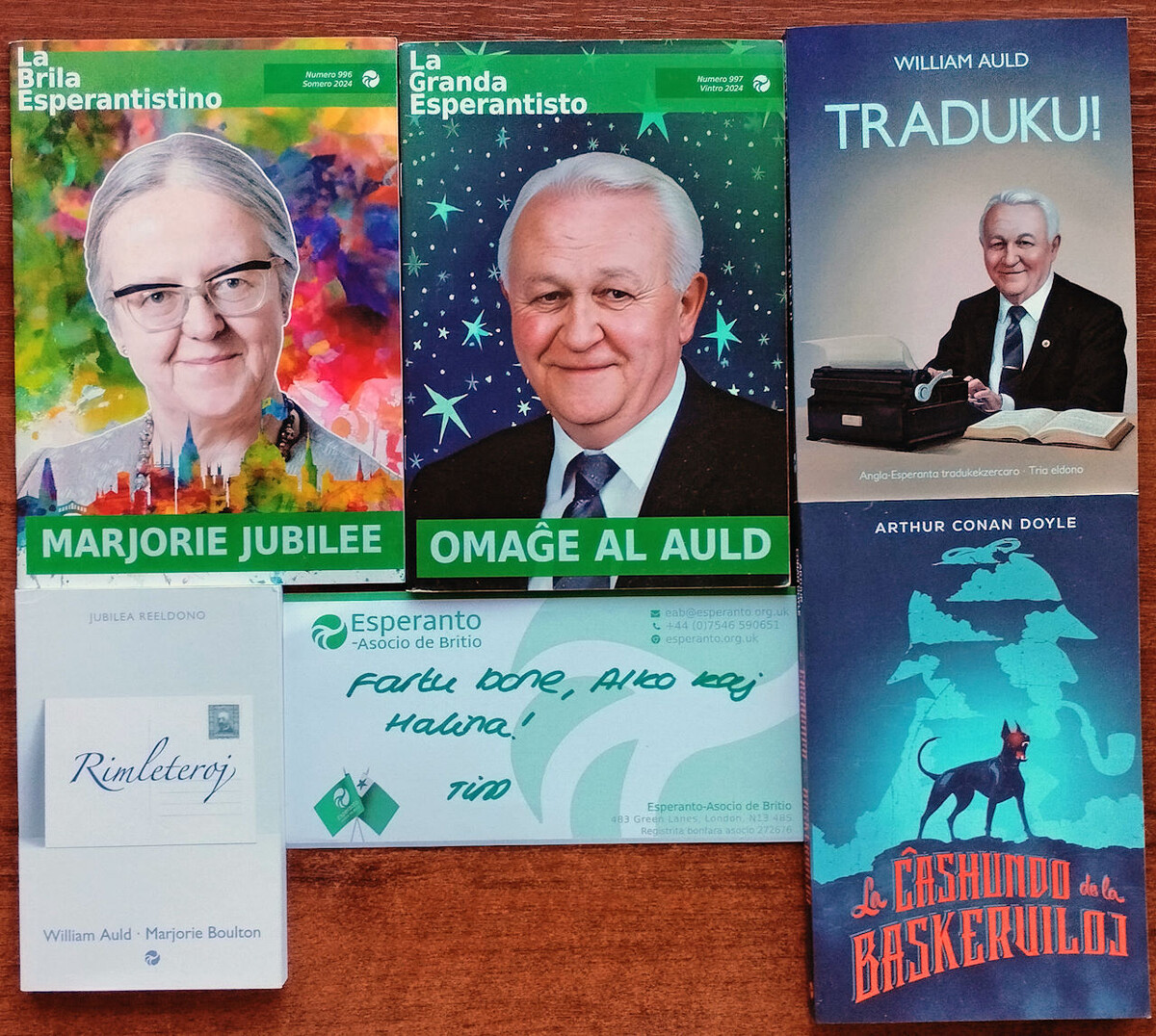 Несколько дней назад мы получили посылку, доставленную Королевской почтой из солнечной Англии. В ней обнаружилось третье издание «Собаки Баскервилей» в эсперантском переводе шотландца Билла Олда, многими считаемого лучшим автором и переводчиком на языке эсперанто. Кстати, у нас осталось только по экземпляру наших изданий 1998-го и 2010 гг. Английский издатель любезно вложил в посылочку ещё пару книг, изданных в программе юбилейного года Болтон и Олда (Jaro Bauldton), родившихся сто лет назад, в 1924-м году, и два номера британского журнала, посвящённых этим юбилеям (извольте заметить, что для юбиляров они, прикола ради, даже название журнала поменяли). Галина моя Романовна, запечатлев книги, утречком улетела (уже четвёртый раз в этом году) в столицу Московии на евроазиатскую тусу, а решил поместить их на стеллаж и обнаружил в одном из журналов ещё три открытки. Пришлось самому их сканировать.
