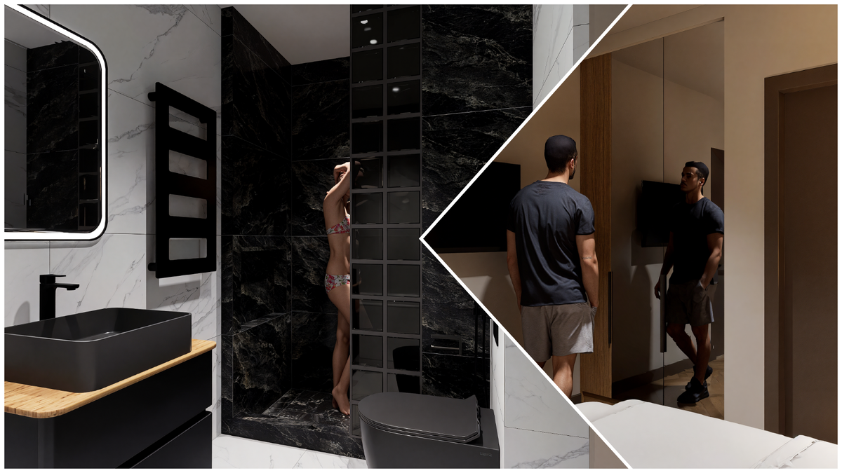 Продолжаю работу над визуализацией комнат в квартире; мои предыдущие записи можно увидеть в этих видеороликах: Сегодня я сделал визуализации мастер-спальни и ванной комнаты в этой квартире. Это компактная комната, где все удобно размещено. Шкаф встроен в углубление стены. С обеих сторон кровати расположены туалетный столик и тумба. Также в комнате есть телевизор и дверь, ведущая в ванную. В ванной комнате умещается ванна и душ. Этот санузел выполнен в черно-белых тонах, что выглядит весьма стильно. Надеюсь, молодым людям, которые будут здесь жить, это придется по вкусу. Тем временем я также занимаюсь разработкой другого цветового решения для ванной комнаты, которое представлю в следующем посте. Ознакомиться с услугами по дизайну можно на моей странице на Houzz.