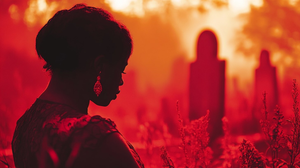 Создано на основе запроса: image displays a gravesite, African american mother crying in the background, the hue is red