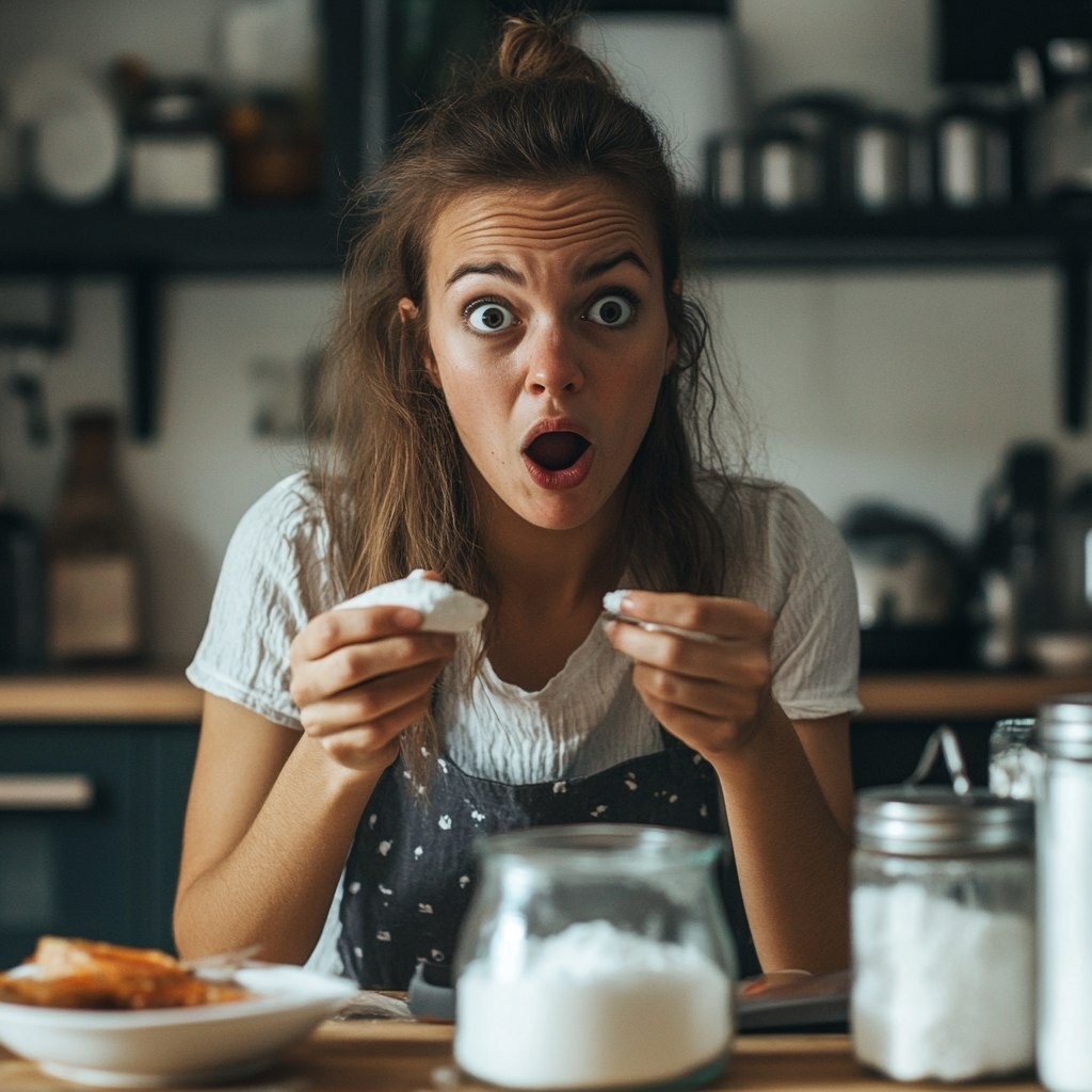 Создано на основе запроса: A person looking surprised while tasting food, with salt and sugar containers nearby