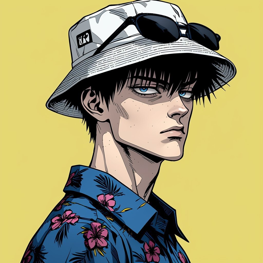 Создано на основе запроса: ide profile portrait of a boy in an anime style, cel-shading, flat design, extreme contrast, simple shapes and lines, wearing a bright cyan Hawaiian shirt with deep magenta floral patterns, a tilted white bucket hat, short messy auburn hair, slender sapphire blue eyes, black sunglasses resting on the nose, natural warm beige skin tone, dramatic lighting, strong cel-shading on face, solid warm yellow background, ultra-detailed ink lines, 8K --- Автоперевод: IDE Profire Портрет мальчика в стиле аниме, разбрызгивании Cel, плоском дизайне, экстремальном контрасте, простых формах и линиях, в яркой голубой гавайской рубашке с глубокими пурпурными цветочными узорами, наклоненной белой ковшой, короткие грязные волосы Оберн, тонкие синие глаза, черные солнце Как тебе картинка? 🤔 https://dzen.ru/id/65c0c65c86e4f837c27b24d7 #ИИ #AI #нейросеть #midjourney #art