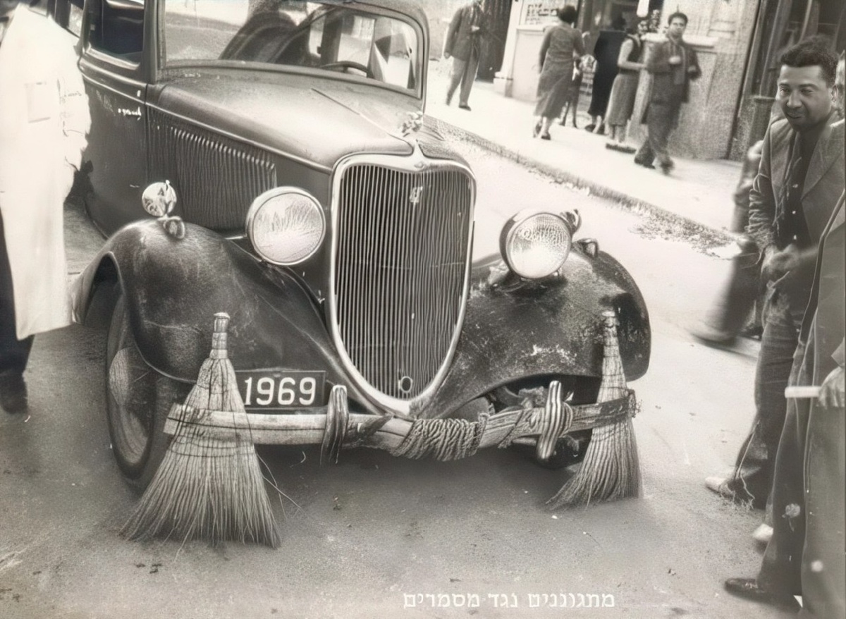 Вот такой нехитрый способ защитить покрышки. Снимок был сделан в Палестине в 1936 году, когда там началось Арабское восстание. На улицах царили беспорядки, и водителям приходилось как-то защищать резину от осколков бутылок, гвоздей и прочих колющих предметов. Обычные метелки! Они и помогли это сделать. На фото есть надпись на иврите "מתנגנים נגד מסמרים". Дословно она означает «Защита от гвоздей».