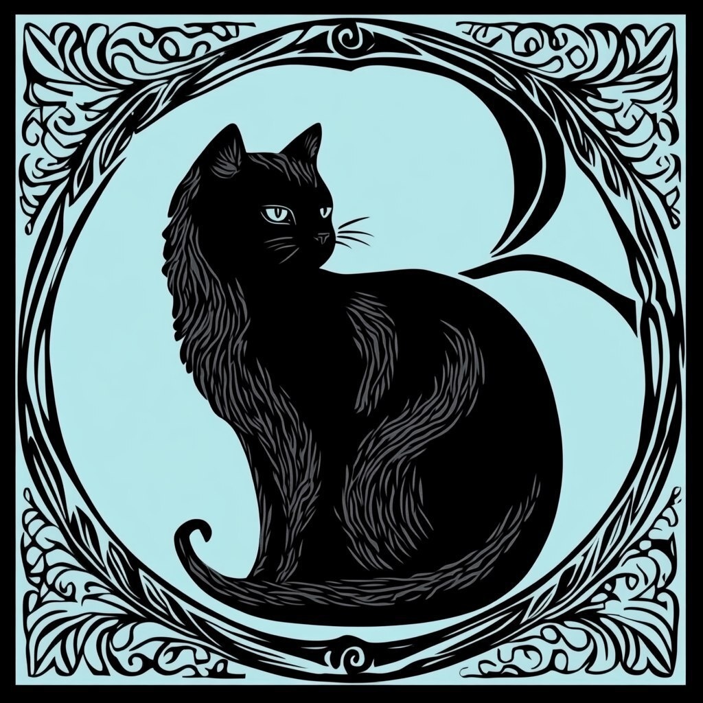 Создано на основе запроса: a black cat shaped like the letter B in the center of a stylized letter C, black, light blue background