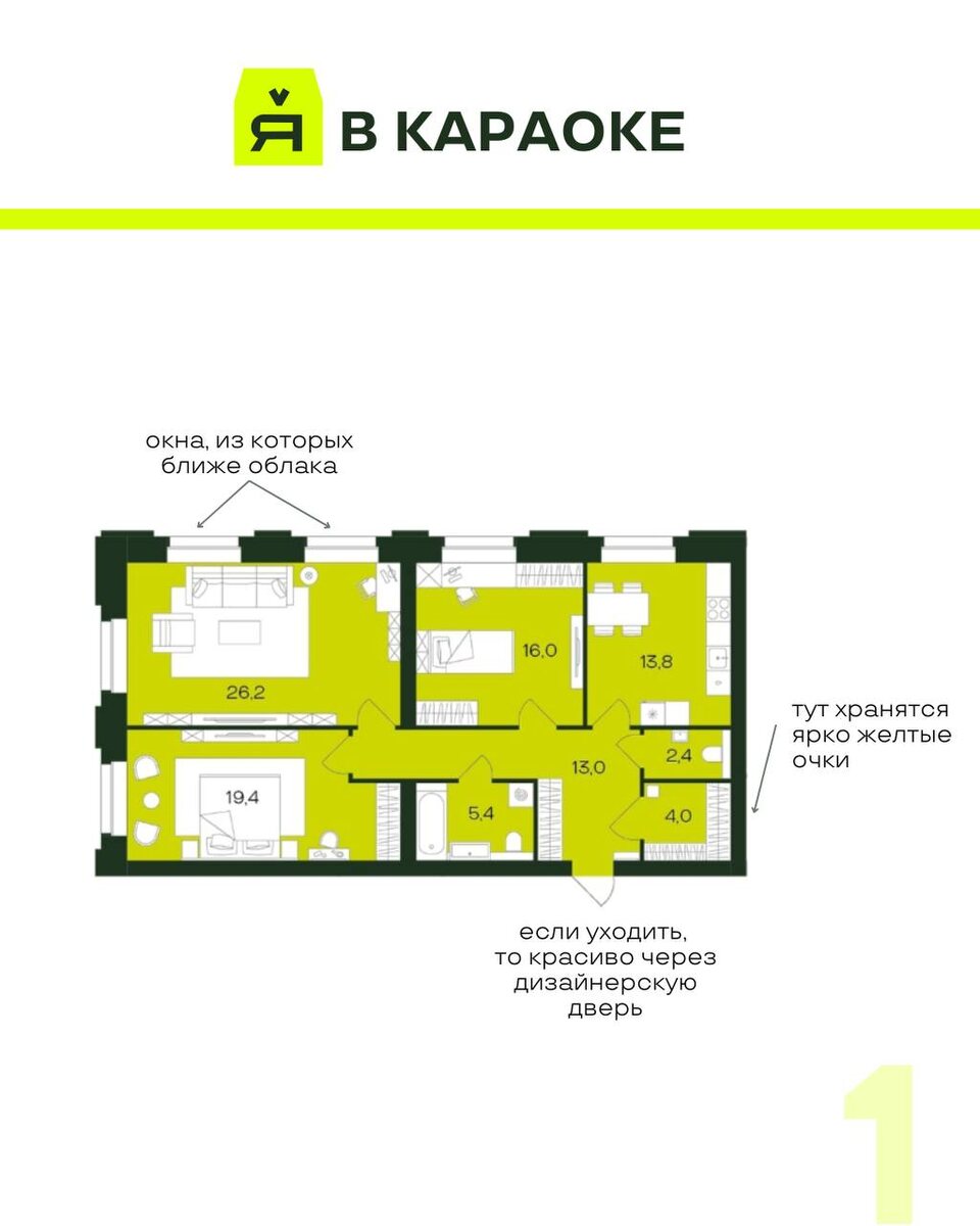ЯЛАВ В КАРАОКЕ угадай песню 🎶 Говорят, пение положительно сказывается на эмоциональном состоянии! Особенно в пятницу 😄 Знаете, что еще положительно сказывается на нем? Покупка новой квартиры! Пока вы угадываете спрятавшиеся песни и выбираете трек-лист для грядущего концерта в караоке или в душе (с соблюдением тихого часа, конечно же), мы предложим вам рассмотреть несколько квартир. Первая Вторая Третья Четвертая Пятая Шестая Седьмая Между делом напоминаем вам про номер 222-555, по которому можно забронировать столик в офисе продаж или сразу квартиру ☎ Звоните!